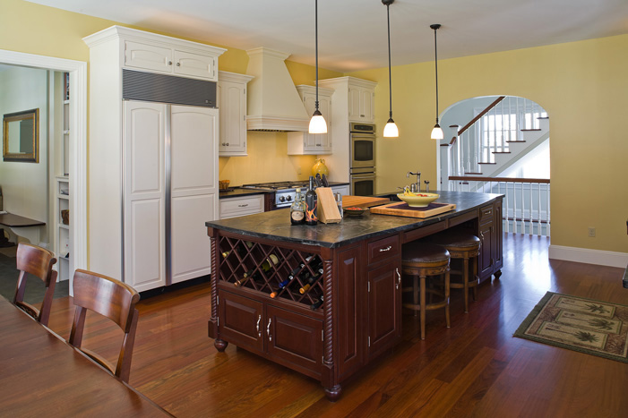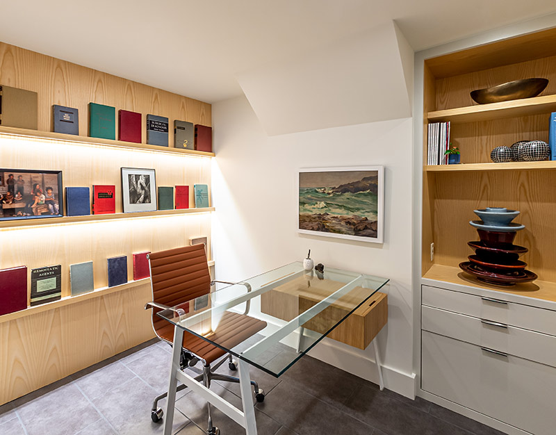 Although there was some partially used attic space above the garage, it was mostly dead eave space. By installing a gable dormer in the back with three windows and then putting in three more casement windows in the gable end, raising the flat ceiling to a semi-cathedral, and throwing in a few skylights, Oxford maximized existing space with minimum disruption to the exterior.