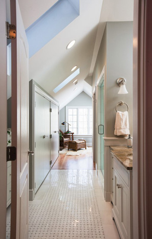 Privacy and intimacy were major factors in this design. Each owner wanted a space of their own but also wanted to retain their daily routine of "catching up" by the sink, which led us to divide the space and install separate entrances, individual water closets, and dressing areas. A custom-built back-to-back vanity enabled sharing while retaining separation; a pass-through shower allowed two people to use it at once without feeling crowded; an oversized soaking tub was installed under the new gable dormer to take advantage of natural morning light; windows could be opened during summer months to allow breezes and sounds of Mother Nature into the bathroom--this ensured a soothing atmosphere aided by subdued colors on walls, warm satin nickel fixtures, and green and white basket weave tiles on floor along with complementing green crackle tiles in the shower (both by Waterworks) to enhance this new sanctuary for these empty nesters.