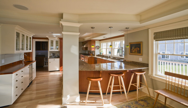 To achieve the owners' desire for a clean contemporary look, muted wall colors and an open floor plan were used. Flooring choices of birds-eye maple, quarter-sawn oak, tile, and cork as well as custom cabinets and shelving designed and built by Oxford Builders helped define the various rooms. Large thermal panes salvaged by the owners from a nearby casino project were installed in the living room and along the curved stairwell to allow for a greater feeling of space as well as to maximize the connection with the outdoors.